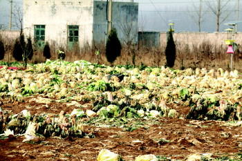 除了安家沟大白菜种植基地外,里岔镇和胶莱镇的多个大白菜种植基地也遇到了同样的冻灾。里岔镇农办工作人员告诉记者,该镇有5个百亩以上的大白菜种植基地“遭灾”,受灾较轻的也减产30%以上。同样为胶州白菜主产区的胶莱镇也是这种情况。在胶莱镇的一些白菜地里,不少还没来得及收获的白菜被冻在了地里,已经枯萎腐败,农户也放弃将这些白菜收割回家。