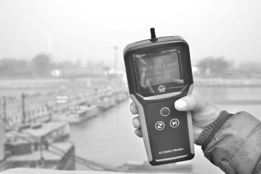 8日上午10点13分,泺口浮桥的PM2.5数值为313.2,PM10数值接近500。本报记者 陈文进 摄