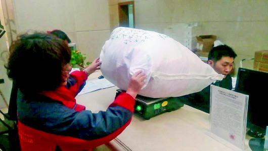 齐鲁志愿者张秀华与工作人员一起把爱心羽绒服寄往沂蒙老区。 本报记者 朱文龙 摄