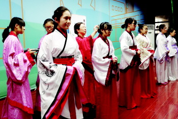伴着古朴典雅的音乐,身着传统汉服的学生手持卷轴,接受老师的加笄、加冠汉服成人礼仪式。日前,在青岛二中分校礼堂里,80多名2013级人文学院学生参加“成人礼”活动。现场,老师逐一为学生们加笄、加冠以示长大成人,学生用传统的汉代礼仪对恩师礼行三拜,并集体颂读成人礼誓词。团委老师金锦说,通过把传统的古代习俗融入到成人礼活动中,希望学生能明确成人涵义、学会主动感恩,承担责任,同时传承中华文化,争做阳光学子。 本报记者 李珍梅 摄影报道