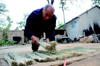 做蓑衣的原料是白茅根和三楞草,徐桂森说茅草必须是伏天收割,因为这个时候的茅草茂盛,而且没有秸秆,秋后的茅草就不能用了。每年这个时候,徐桂森老人都会去河滩里收割茅草,整理好后晾晒,然后一根一根地整理好备用。“平时没事就可以编,这个活需要耐心,一个蓑衣要一千多个扣,最快也要两三天才能做好一个。”