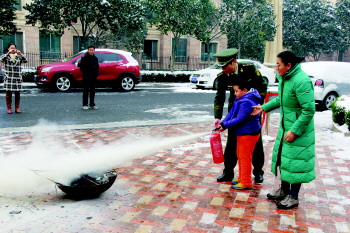 理论培训结束后,宣传人员给小朋友们演示了灭火器的使用方法,小朋友们在宣传人员的指导下完成了灭火演练。