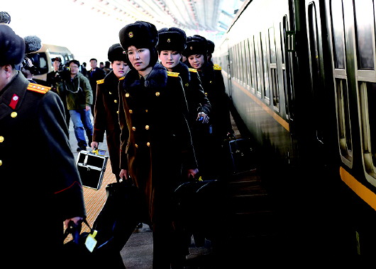 10日,牡丹峰乐团成员乘火车抵达北京站。 新华社发
