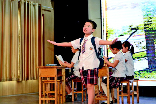 8日上午,长清区小学生学习习惯养成现场会在长清实验小学举行。现场会期间,参会代表观摩了课堂教学,观看了学生自演的微电影、舞台情景剧,并根据参观体验相互交流了心得经验。图为小学生现场表演的舞台情景剧《实小小的幸福生活》。