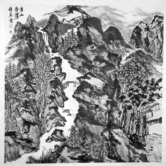 与书法相比,秦维东学画较晚。人到中年,始操画笔,孜孜以求,勾勒山水。胸中有丘壑,出手必不凡,大自然灵动的韵律,蕴含于维东之笔端。浓墨如漆,汪洋恣肆;淡墨氤氲,飘渺如烟。百禽鸣啾,百花绽放,泉水叮咚,可观可闻。群峰耸翠,林壑幽邃,清气超逸,新风扑面。片石勺水,无边风月,荷载着无限深情与禅意,直抵观画、赏景、明禅、悟道的精神家园。欧阳修《醉翁亭记》之佳句,可以形容其画之美妙:“若夫日出而林霏开,云归而岩穴暝,晦明变化者,山间之朝暮也。野芳发而幽香,佳木秀而繁阴,风霜高洁,水落而石出者,山间之四时也。朝而往,暮而归,四时之景不同,而乐亦无穷也。”