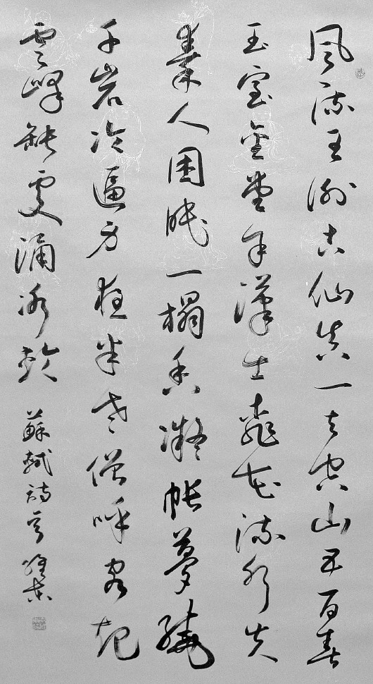 道可道,非常道;名可名,非常名。秦维东爱好广泛,尤爱易经,时常以书观道。其书法作品渗透了“颠张醉素”的野逸烂漫,愈显自由疏放,雍容华美;传达给鉴赏者的是一派风流笔意,如岱宗刻石,老辣工稳,古意斑驳。细品之下,每个字又各具体势,或温婉妖娆,或端庄秀丽,如临锦山绣川,处处佳境,耐人寻味。