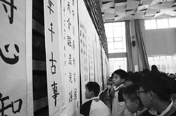 由济宁市政协书画联谊会、济宁市教育局语言文字工作委员会、邹鲁画院共同主办的书画文化进校园暨书画作品校园巡回展在济宁市文昌阁小学举行。此次活动参展书画作品共100余幅。 本报记者 汪泷 刘兴权 通讯员 付吉庆 摄