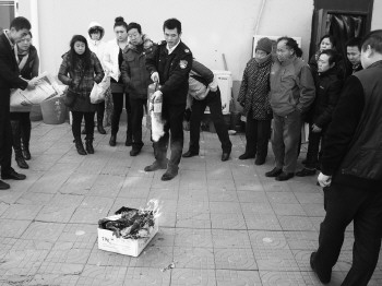 10日,在潍坊市城关街道芙蓉街社区,防火专家正在向居民展示灭火器的使用方法。冬季是火灾高发季节,为了预防火灾发生,社区邀请防火专家到社区为居民讲解防火知识和灭火器的使用方法,提高大家的防范意识。