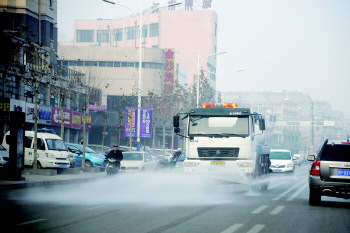 为缓解雾霾带来的影响,12月10日,德州市环卫处出动全部可利用的设备车辆,对辖区主干道进行洗扫,最大程度降尘。