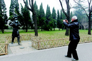 10日,在市人民公园一位市民给戴口罩的雕塑拍照。 本报见习记者 李洋 摄