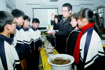 在淄川区峨庄中学的植物学科工作室里,肖宏平正向学生讲解认识各种植物。通讯员 闫盛霆 摄