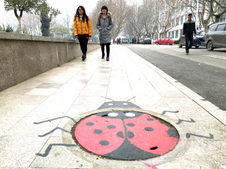 枣院大学生将灰暗井盖当画布,为校园新添一景