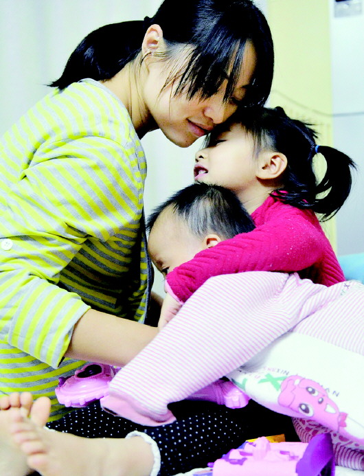 琪佳和妹妹琪妙俩人争相往妈妈秀华怀里钻,当妈妈的感觉很幸福。
