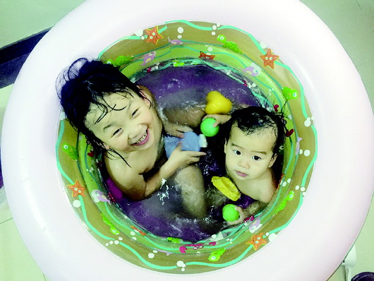 ◤姐姐俊汐和妹妹盈汐两个宝贝一起洗澡,好不欢乐。
