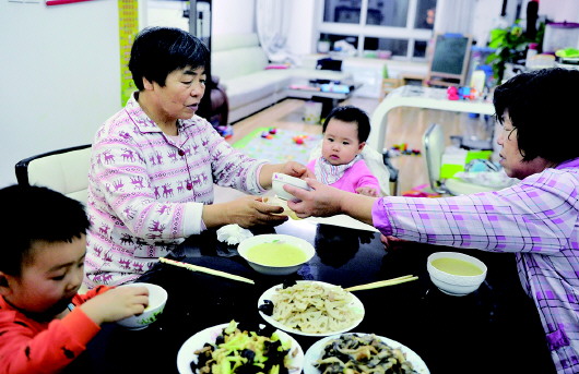 奶奶和姥姥争相喂Seven吃饭,沐沐已可以自己动手。