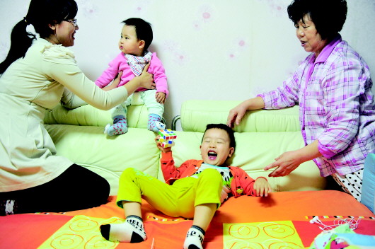 妈妈看着妹妹Seven,姥姥看着哥哥沐沐,奶奶去做饭。自从二孩一来,全家人都忙了起来。