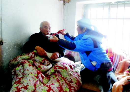 “来,慢点吃。”14日中午在青岛即墨田横镇黄官屯村,孙春暖把双目失明的外舅婆搀到椅子上,一勺一勺地喂饭。外舅婆已经97岁,在不远处的炕上,还躺着孙春暖需要照顾的外舅公,今年107岁。