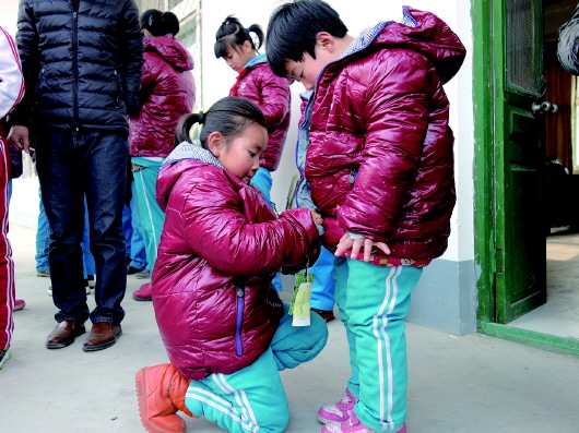 穿上崭新的羽绒服之后,一个小姑娘半跪在地上,给自己的小伙伴拉上拉链,令人感动。       本报记者 肖龙凤 摄