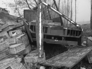 早上六点半左右,青州路政大队接到报警称,在银川方向197公里处附近,一辆大型货车由于操作驶入掉入路边沟,急需救援。路政人员赶到现场后发现,一辆滨州牌照的大货车顺着高速路的方向停放在边沟内,车身后方的车厢受损比较严重,几块挡板都在事故中被撞击掉落下来,横七竖八地散落在地上。此外,车身的左侧堆放着几百个白色的塑料箱,有的还比较完整,里面装着五六只白羽鸡,有的箱子已经破损了,里面装着的白羽鸡跑了出来,到处散步吃食。还有相当一部分白羽鸡在事故当中“殒命”,有的被压在了车身或塑料箱下面,有的被摔死在地面上。
