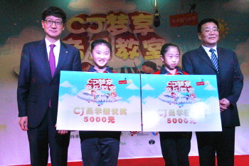 聊城市委常委、副市长张旋宇(右一)和CJ集团中国区总裁朴根太颁发CJ品学兼优奖。 本报记者 李军 摄