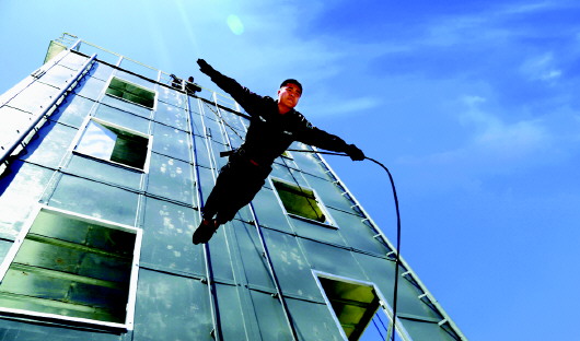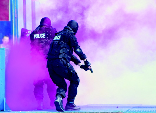 特巡警,首先“特”在训练上。不管寒冬酷暑,每天早晨6时,在特巡警训练场上,一声声嘹亮的号子展示着特巡警的声威。匍匐穿越10米低桩网、翻越2.4米高板、通过4米高的空中软网、连续5次翻滚100千克重的轮胎、迅速完成92式9毫米手枪的分解结合……这是突击攻坚专业队的训练内容。