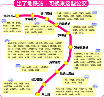 15日,交运集团和公交集团分别发布公交换乘方案,10个地铁站点周边共有70多条公交线路。“地铁北段周边500米内,公交集团有60多条公交线路。地铁正式开通以后,公交集团还将根据地铁客流变化,及时调整运行班次和运行间隔,满足市民换乘需求。”公交集团营运管理处负责人说。温馨巴士工作人员介绍,16日起,途经3号线始发站火车北站的临1路、临2路、603路早晚高峰发车间隔调整为5-7分钟一班,对接双山站的465路,将实时根据客流调整发车间隔。605路将全天加密发车班次,并在早晚高峰配备机动运力,发车间隔调整为2-3分钟一班。