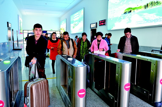 青荣城际铁路开通以来,到荣成看大天鹅、吃渔家饭、住海草房的游客大幅攀升,荣成市的冬季旅游市场持续升温。今年冬季,已有2万名各地游客坐动车到荣成看天鹅。图为青荣城际铁路荣成站出站口,大量乘客走出。
