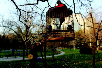 15日是近期难得的好天,市民在公园遛鸟。