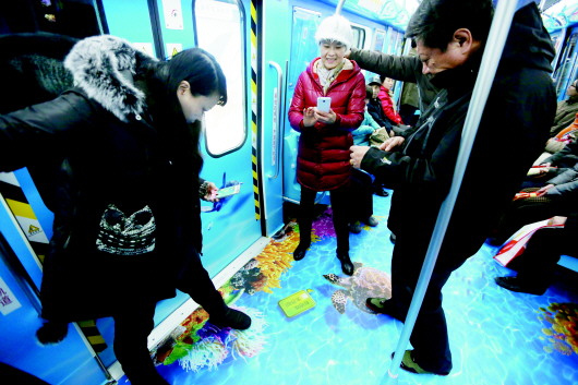 16日上午11时,我省首条地铁线——青岛地铁3号线北段开通试运营,起步价2元,6小时内有近两万人乘车体验。3号线列车最高运行速度80公里/小时,北段单程仅需19分50秒。列车内充溢着“海味”、青岛味,16日运行的列车中有一列内饰是海洋生物主题的3D彩绘,堪称“移动的海底世界”。 本报记者 张晓鹏 摄