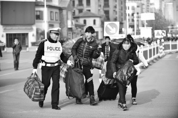 霍连营帮赶火车的旅客拿包。