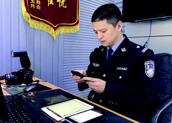 采访期间李光明手机不离手,不停地更新发布警务信息。 刘潇 摄