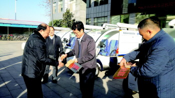 ◤市食药监局负责人为县区局代表发放流动食品快检车钥匙。 本报记者 董梦婕 摄