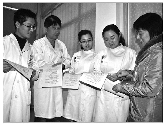 新矿医院创建省级文明单位领导小组成员李玉芹向医护人员解释明白纸上的内容及涵义。