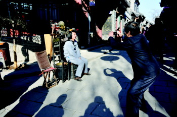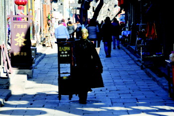 每天都有很多游客与聂观鸣合影,而他的收费也不高,3元钱随便照,他说他的目的是向更多人宣传古商城,宣传周村文化,一些非洲、俄罗斯、美国等外国游客都与他合过影,他还拍过微电影。