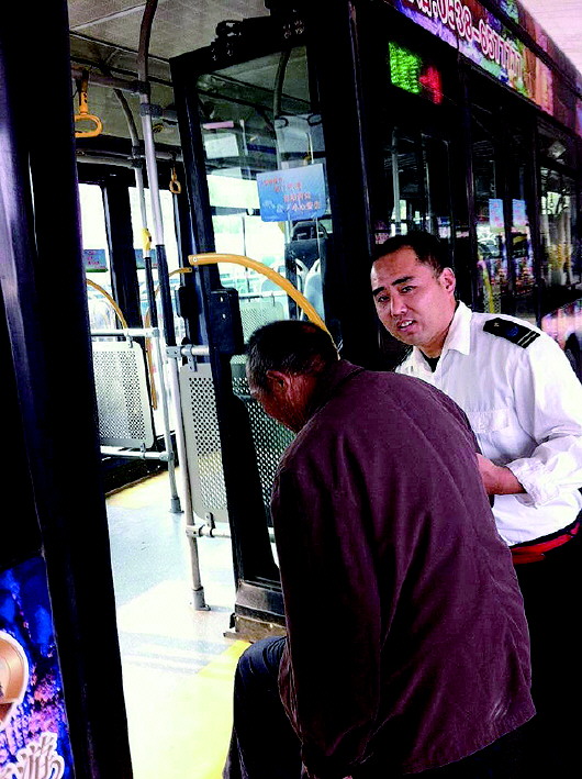 BRT4号线驾驶员王先红在搀扶老人下车。