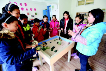 15日,在洮南路小学,学生们在心灵成长俱乐部体验心理沙盘游戏。当天,市北区第三教育联盟召开“课程建设与实施”推介会,十余所联盟学校从“课堂教学片段展示”、“课程研发与实验经验汇报”、“微型沙龙”三部分展示各自在心理教育课程方面的优势。