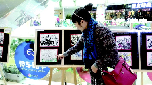 ◥李越然的画看似涂鸦,但细看都有自己的规则。 本报记者 万兵 摄
