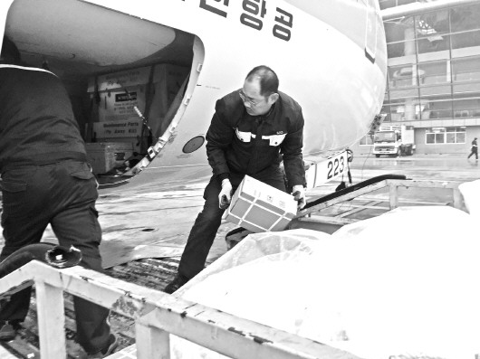 工作人员正在将国内生产的玩具机器人搬到飞机上。 本报记者 赵波 摄