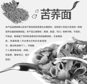 苦荞面精选西部海拔2500m以上高寒地区优质无污染苦荞为原料,经由浸洗、脱壳等特殊工艺制成,苦荞含量高达60%以上。生产过程采用专利技术及进口意大利通心粉设备,将苦荞面制作成贝壳状,既美观又兼具“养生、保健、食疗”三重功效。