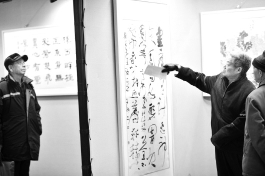“草书、行书、楷体……展出的书法作品虽多,但是品格各异,表现形式也不一样。”家住济南五龙潭附近的杨宪新今年78岁了,从小练书法,至今已近70年。在仔细地欣赏完一幅幅作品后,杨宪新老人说,这次书画展展出的作品具有极高的学术水平和欣赏价值,作为书法爱好者,自己学习到了很多。