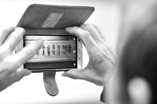 一名观众用手机把作品内容拍下来,带回家慢慢欣赏。 本报记者 陈文进 摄