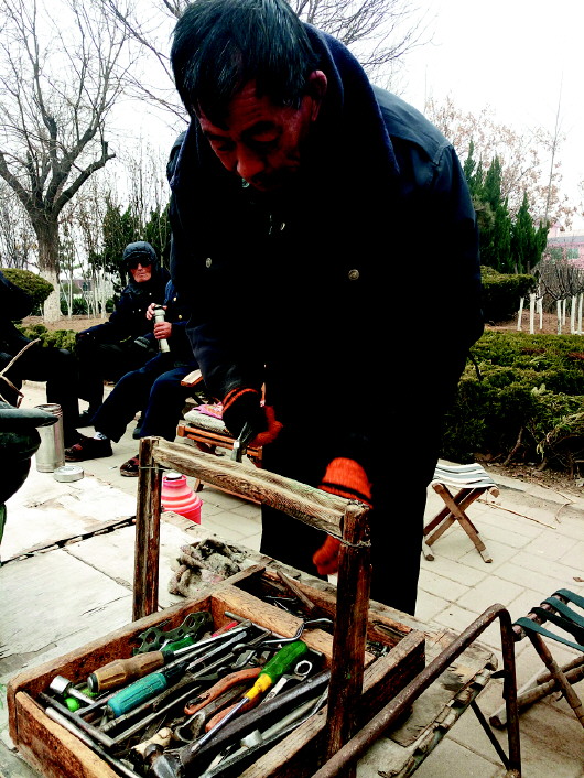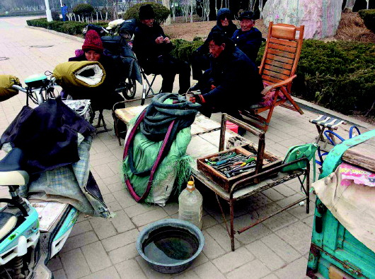 天气越来越冷,沿街的叫卖声渐渐地少了,人们行走在街道上都裹得严严实实,害怕被冷风“侵蚀”。但在商河县城的各大街道上却还隐匿着像宁青船这样的修车工人,即使天再冷、风再大他们依然坚守着自己的阵地,“干了十多年了,每天出摊已经成了习惯,不出摊老是害怕老顾客找不到自己。”63岁的宁青船说。