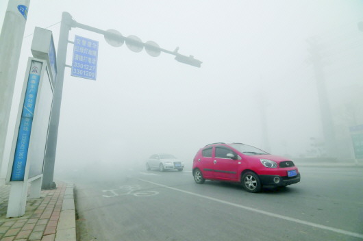 23日上午,滨州街头雾霾重重。