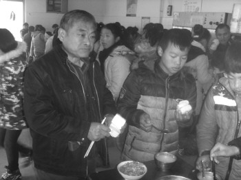 农村学校食堂条件比较简陋,所谓“留守餐”也没有特别准备。就是跟着孩子一起到食堂里打一份大锅菜,然后一同挤在学生之间吃个饭。然而,中午一同吃饭时,赵新峰见爷爷到学校来看他非常高兴,不仅争着给老人打了饭,还不时说着学校里的一些趣事。赵大爷说,没想到平时在家沉默寡言的孙子,竟然也有谈笑风生的时候。一顿饭时间下来,爷孙俩你一言我一语地笑声不断。