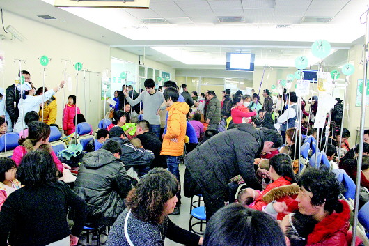 在青岛妇儿医院,挤满了来输液的孩子。