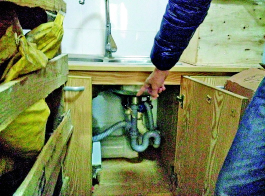 ◤王先生向记者展示厨房里泄漏污水的管道。