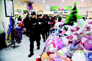 12月24日平安夜,城区各大商场涌入不少购物的市民,为防止发生安全隐患,特警人员进入人员密集场所巡逻执勤。 本报记者 马志勇 摄