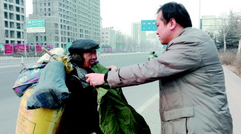 张店区民政局上街为流浪乞讨人员送御寒物资。