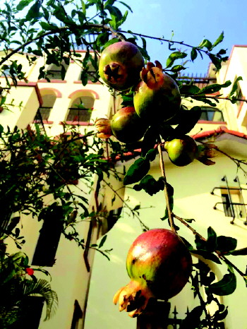 “我特别喜欢绿色植物,以前住在济南家里会养一些绿萝、幸福树等等……我觉得绿色植物有种魅力,让人变得安静。来蝶泉湾住了快一个多月了,每天都住在绿植围绕的房间里特别舒服。”孙淑英对蝶泉湾社区的绿色植物十分中意。“明天你们也会去呀诺达热带雨林风景区,里面的很多植物在咱们小区都会有,而且咱们院子里有很多芭蕉树、木瓜树、菠萝蜜树……很多品种在济南我都没有见过,我没赶上小区的芒果大丰收,这次正好赶上石榴成熟,再过一阵子就可以摘下来吃了。”孙老师在小区里边走边向大家介绍。