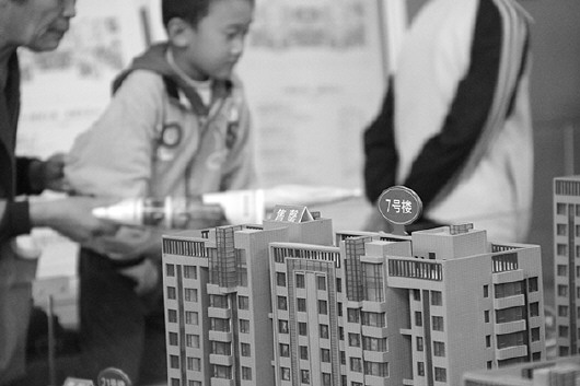 潍坊市区一楼盘售楼处,有市民带着孩子看沙盘。